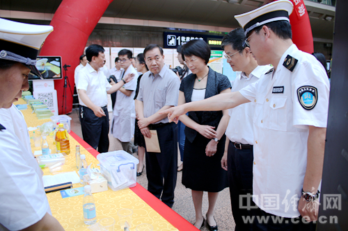 中國(guó)鐵路總公司黨組成員、副總經(jīng)理李文新(左5)、國(guó)家食品藥品監(jiān)督管理總局新聞宣傳司司長(zhǎng)顏江瑛(左6)、國(guó)家食品藥品監(jiān)督管理總局食監(jiān)二司稽查專(zhuān)員柴保國(guó)(左4),以及鐵路總公司、北京鐵路局相關(guān)負(fù)責(zé)人出席啟動(dòng)儀式。中國(guó)經(jīng)濟(jì)網(wǎng)記者 韓肖/攝