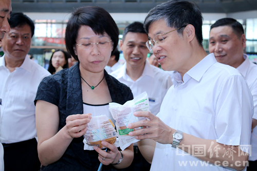 中國(guó)鐵路總公司黨組成員、副總經(jīng)理李文新(右)向國(guó)家食品藥品監(jiān)督管理總局新聞宣傳司司長(zhǎng)顏江瑛(左)介紹新推出的鐵路配餐食品。中國(guó)經(jīng)濟(jì)網(wǎng)記者 韓肖/攝
