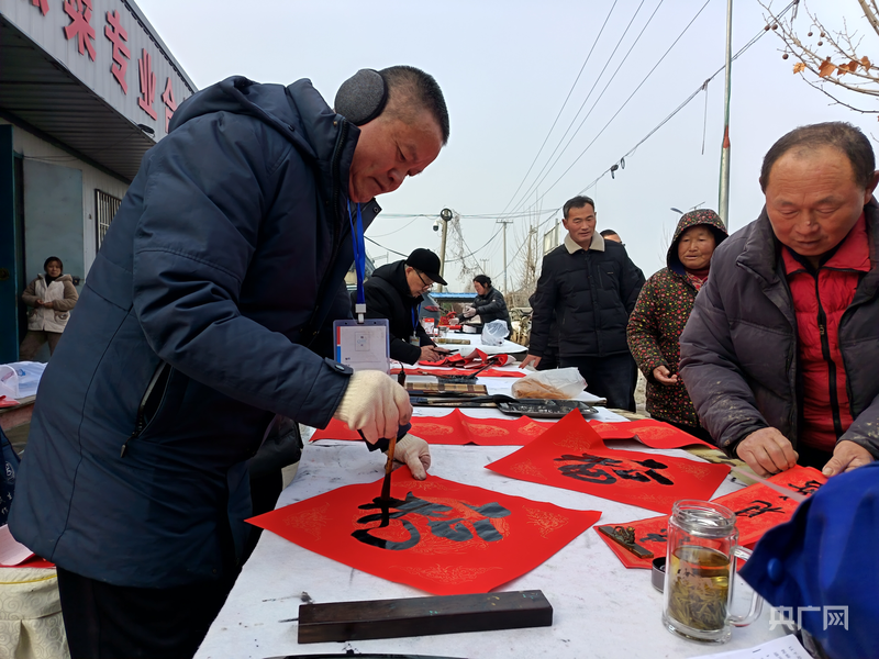 蕭縣與碭山兩地的書(shū)法家們齊聚程莊鎮(zhèn),為當(dāng)?shù)卮迕衩赓M(fèi)書(shū)寫(xiě)并贈(zèng)送春聯(lián)(央廣網(wǎng)發(fā) 王安 攝)
