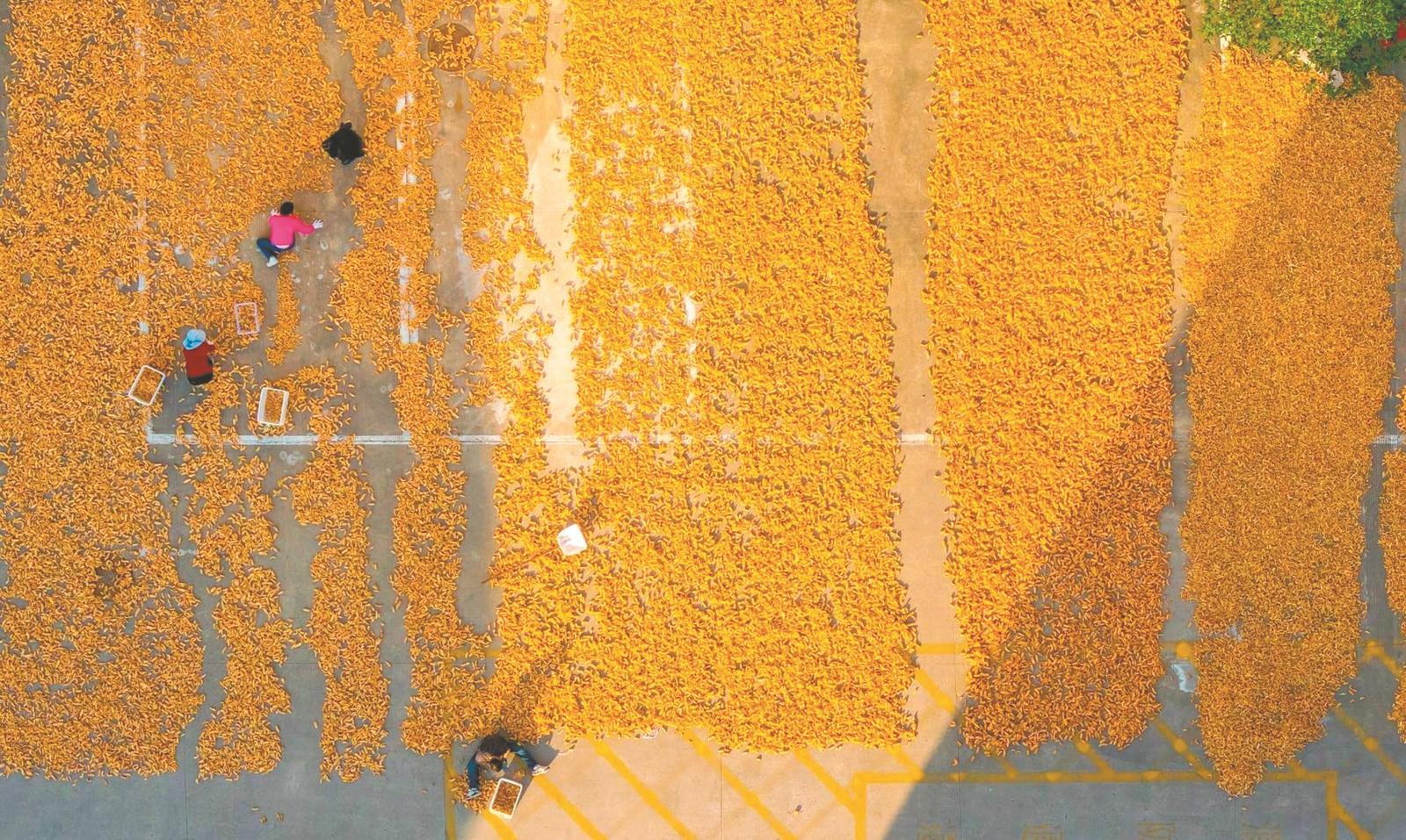 在位于金寨縣的中國藥用菌大市場(chǎng),藥商正在晾曬藥材。