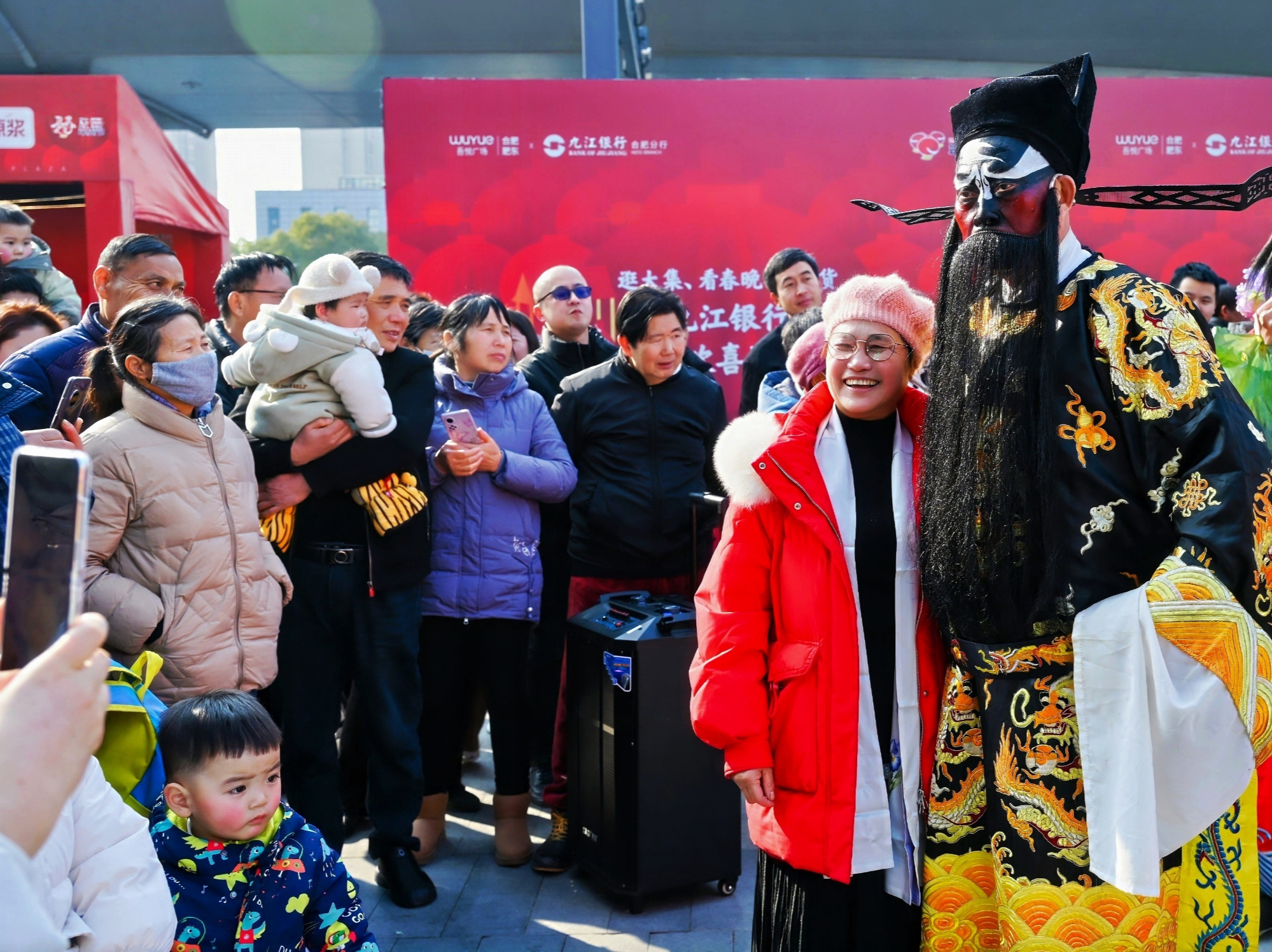 活動現(xiàn)場,人聲鼎沸,一派熱鬧喜慶的景象。舞龍舞獅率先點(diǎn)燃全場氣氛,黃梅戲、廬劇、曲藝、包公劇目等國潮國粹非遺演出輪番上演。