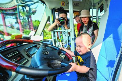 昨天,在北京公交駕校,小朋友坐上最新款電動(dòng)公交車駕駛座拍照留念。本報(bào)記者 鄧偉攝