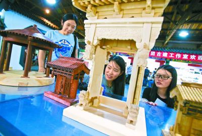 昨天,參觀者在北京房地集團(tuán)古建工作室內(nèi)觀看傳統(tǒng)建筑模型。 本報(bào)記者 武亦彬攝