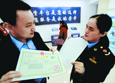 1日早上,在豐臺(tái)工商分局注冊(cè)大廳,華研環(huán)科(北京)科技有限公司的相關(guān)負(fù)責(zé)人從國家市場(chǎng)監(jiān)督管理總局登記注冊(cè)局局長(zhǎng)熊茂平手中接過了一張?zhí)厥獾臓I業(yè)執(zhí)照,這是本市首份新版營業(yè)執(zhí)照,標(biāo)志著新版營業(yè)執(zhí)照在京正式啟用。