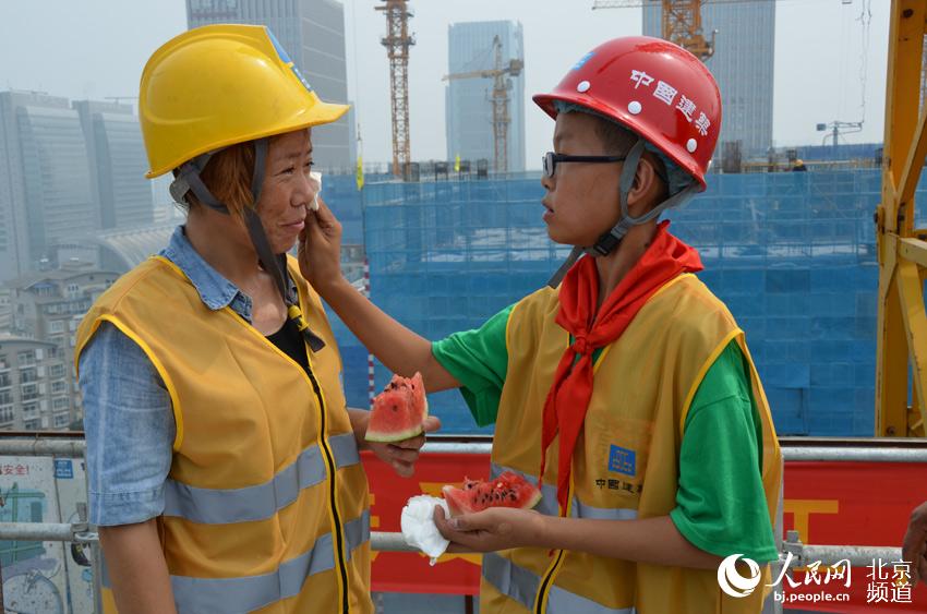 李帥恒為父母送上西瓜,并為他們擦拭汗水。人民網(wǎng)尹星云 攝 -