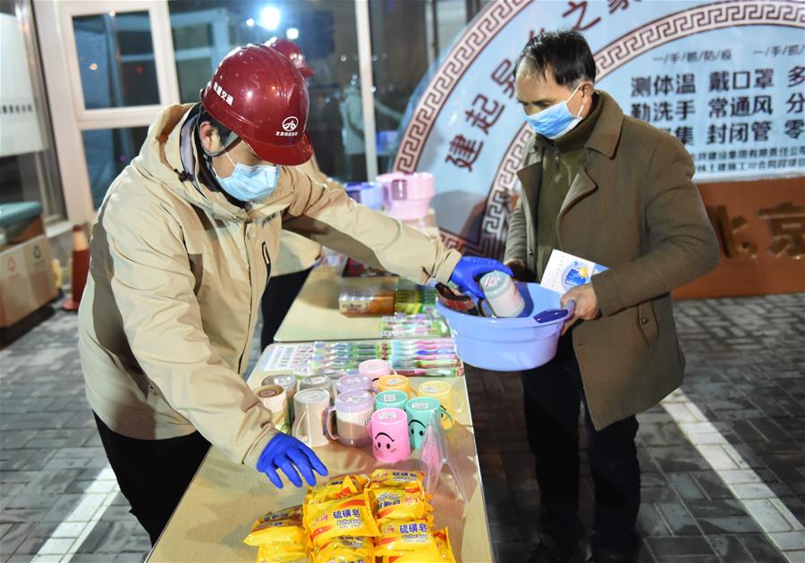 2月20日,返崗務工人員領取生活用品。當日,30名來自四川廣元的務工人員乘坐返崗專車抵達北京市政路橋市政集團四公司地鐵12號線10標項目所在地,他們是疫情期間該項目以“點對點”的方式接來的首批返京務工人員。抵達后,務工人員第一時間接受測溫、消毒等防疫措施,并將進行為期14天的隔離觀察。新華社發(fā)(陳鐘昊 攝)