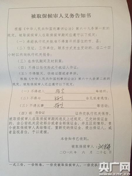 此時(shí)的劉建軍,還處于取保候?qū)徶,只是取保候(qū)彽氖掷m(xù)還沒有辦完。羅先生向記者提供了三張他從濟(jì)南警方那里帶回來的法律文書,一張是濟(jì)南市公安局對(duì)劉建軍的取保候?qū)彌Q定書原件,蓋有濟(jì)南市公安局的公章;一張簽有劉建軍名字的被取保候?qū)徣烁嬷獣贿有一張是打印有劉璐名字和性別的取保候?qū)彵WC書,其他應(yīng)填信息均為空白。