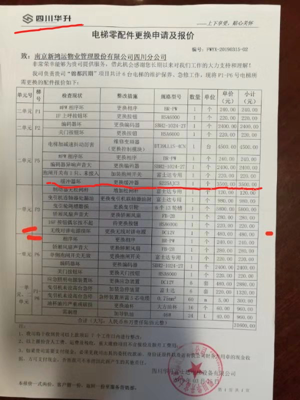 去年修電梯,“華升富士達(dá)”給的報(bào)價(jià)單,同一個(gè)零件,型號(hào)完全相同,同一家公司,價(jià)格相差一倍