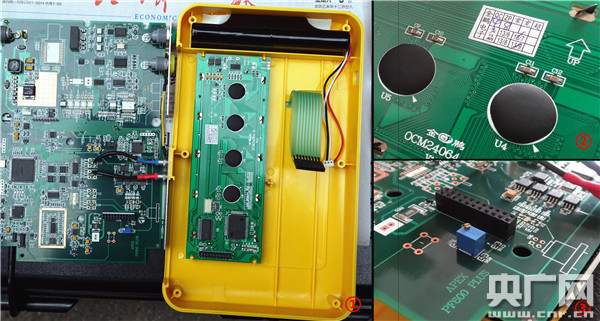 仿冒英國梅克羅尼PF600plus產(chǎn)品內(nèi)部。顯示器電路板上印有“金鵬電子”字樣,而主板上則印有“APEX PF600 plus”字樣。(拼版圖片)