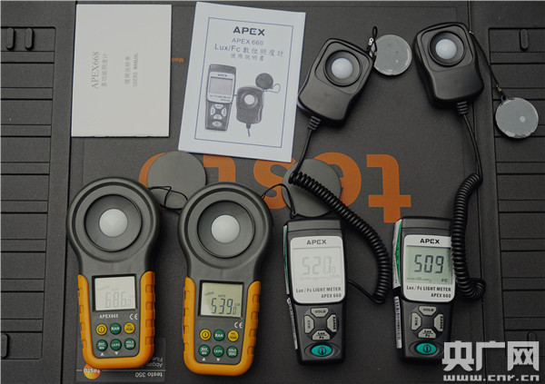 出于對執(zhí)法設(shè)備質(zhì)量的擔心,廣西節(jié)能監(jiān)察中心把另外兩款節(jié)能監(jiān)察儀器設(shè)備——美國鼎翼(APEX)生產(chǎn)的兩款照度計送去廣西計量院檢測,檢測結(jié)果也不樂觀。尚未開封使用的四部照度計,在同樣的條件下,讀數(shù)完全不一致。