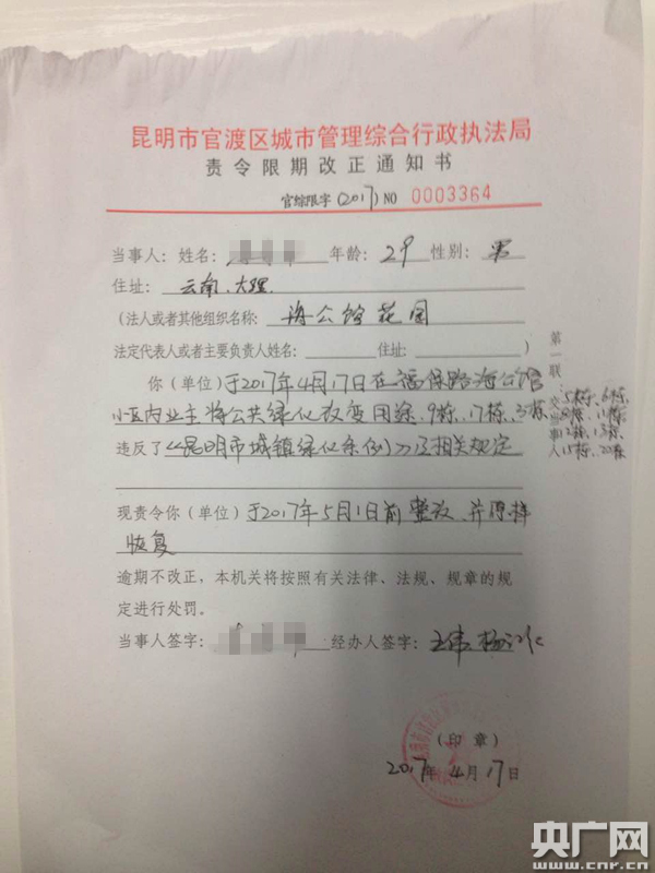 而一樓業(yè)主的說法,也被開發(fā)商云南招商城投公司所認(rèn)可。一位樓盤售后經(jīng)理證實(shí),“當(dāng)時買房的時候,一樓的業(yè)主是可以使用這個花園的,其他業(yè)主都簽過字的,這不叫侵占。只是說對花園的使用以及圍合的面積,還有一些樣式有一些規(guī)定,不能夠改變他原來圍合的形式,F(xiàn)在有個別業(yè)主,圍合的部分超出了原來規(guī)定的高度,還有些局部硬化了,我們要求他整改!