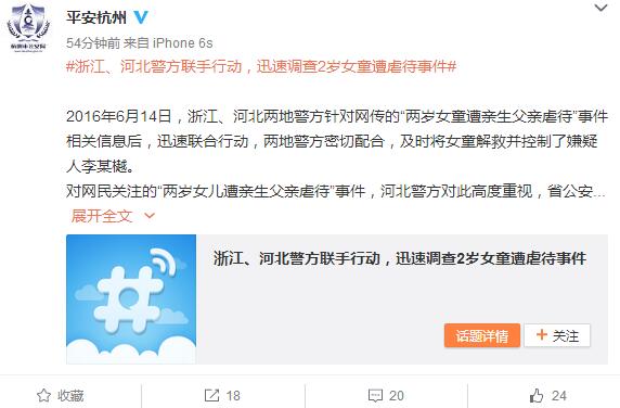 央廣網(wǎng)杭州6月16日消息(記者張國(guó)亮 李佳 河北臺(tái)記者白雪峰)據(jù)中國(guó)之聲《新聞縱橫》報(bào)道,孩子是父母的心頭肉,疼都來(lái)不及,然而,近日,一則“河北兩歲女童遭親生父親虐待”的消息,在微博平臺(tái)持續(xù)發(fā)酵。這條微博稱“親生父親揚(yáng)言要打死女兒”,還附上了4張被打女童的照片,孩子身上多處布滿了淤青和血跡。發(fā)微博的人正是孩子的母親。14日下午,在河北、浙江兩地警方共同努力下,女童父親在杭州被警方控制。