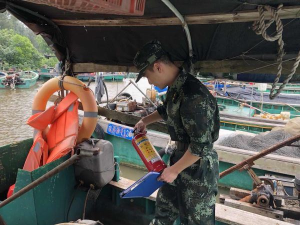 風(fēng)雨影響前,消防人員檢查漁船情況。(圖片來(lái)源:海口臺(tái)記者張瓊提供)
