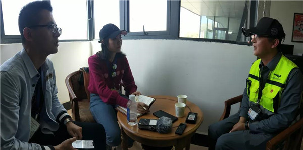袁龍(右一)接受記者采訪(圖片由民航西藏區(qū)局提供)