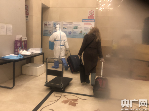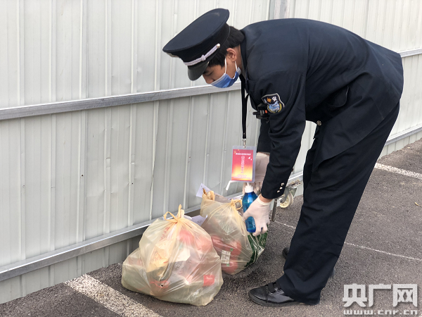 工作人員為被隔離者送物資(中央廣播電視總臺央廣記者 白杰戈 攝)
