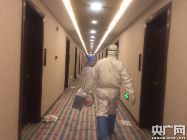 在酒店內(nèi),專門分隔出不同的區(qū)域,從工作人員的生活區(qū)進入被隔離者居住的樓層,需要穿防護服,戴口罩、雙層手套、護目鏡等全套的裝備,返回的過程要經(jīng)過緩沖區(qū)的幾次消毒。隔離的樓層,走廊上鋪了彩條塑料布,每個房間門口有指定放置垃圾的地方。工作人員介紹:“先消毒、收垃圾,收完垃圾送飯。消完毒,垃圾收走了,環(huán)境是干凈的了,我們才能給大家送飯。在每個門把手上掛好,然后敲門,讓每間房的房客輪流出來拿飯,不要同時出來,垃圾也要定時定點地收,一天三次!