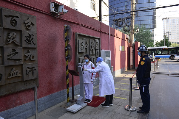 北京市海淀實驗中學(xué)門口開辟兩條進(jìn)校通道,保安提醒學(xué)生相隔一米排隊,接受體溫監(jiān)測。