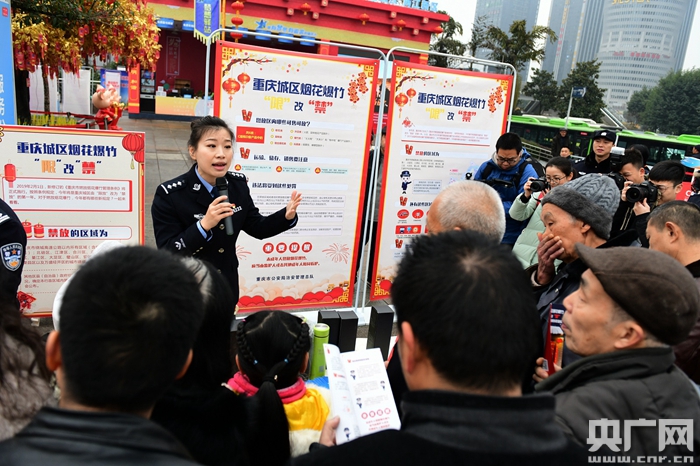 “禁止燃放煙花爆竹,共創(chuàng)文明綠色家園!1日開始,主城區(qū)繞城高速以內區(qū)域以及北碚區(qū)、渝西片區(qū)城市建成區(qū)全年禁止燃放煙花爆竹。違法燃放將受處罰!”活動現(xiàn)場,治安總隊民警通過懸掛宣傳禁放條幅、向過往旅客尤其是外地返渝群眾分發(fā)《重慶市燃放煙花爆竹管理條例》和《重慶市人民政府關于加強燃放煙花爆竹管理的通告》、贈送宣傳手冊和小禮品等方式,宣傳禁止燃放煙花爆竹相關知識,讓大家意識到燃放煙花爆竹的危害,引導大家提高守法自覺性,文明過年、平安過節(jié)。同時,民警還耐心向大家講解警方服務學校29條、社會面大巡防等相關措施以及戶政方面的各項便民利民新舉措。