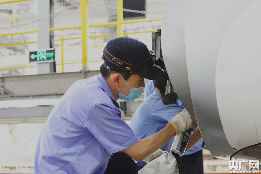 成都動車段職工正在對動車組檢修,確保零故障出庫(央廣網(wǎng)發(fā) 通訊員胡志強 攝)