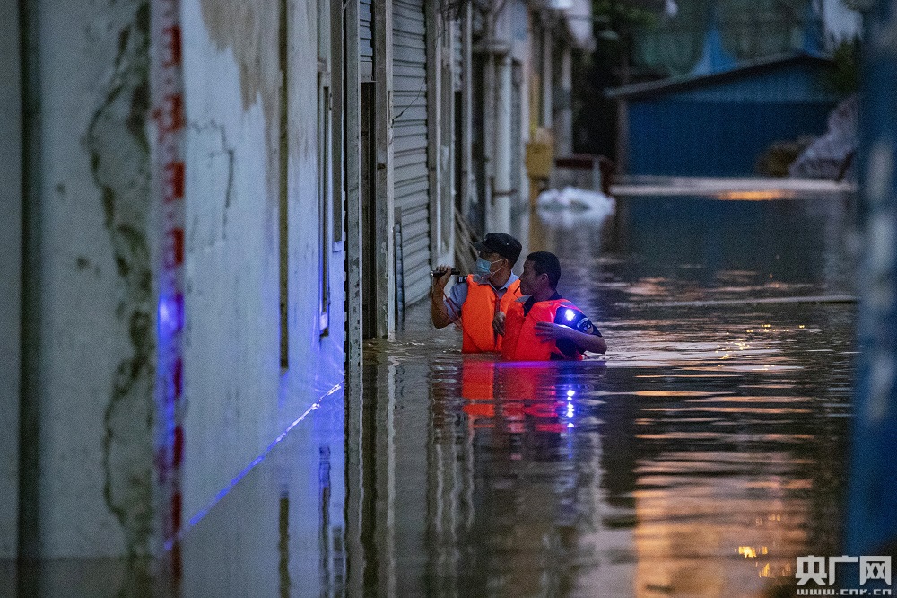 當(dāng)天19時(shí)許,又有一名群眾跑來求助稱,自己家人不聽勸阻在市場(chǎng)庫(kù)房轉(zhuǎn)運(yùn)物質(zhì),民警電話聯(lián)系不上轉(zhuǎn)運(yùn)物質(zhì)的群眾,而庫(kù)房離岸邊約有50米遠(yuǎn),此時(shí)天已經(jīng)逐漸黑了下來,水位還在迅速上漲,再這樣下去太危險(xiǎn)了,陳書凱和朱正全對(duì)視一眼,怕不?倆人異口同聲問了對(duì)方,感受到彼此的默契,倆人相視一笑,穿上救生衣,用一根彼此繩子拴在一起,這就是兩個(gè)旱鴨子給自己準(zhǔn)備的全部防護(hù)措施。經(jīng)過兩人的數(shù)分鐘的勸說,轉(zhuǎn)運(yùn)物質(zhì)的群眾從另外一個(gè)方向撤離到安全區(qū)域,返回岸上的途中,兩人還不忘打開手電筒沿途巡查,以免遺漏受困群眾。