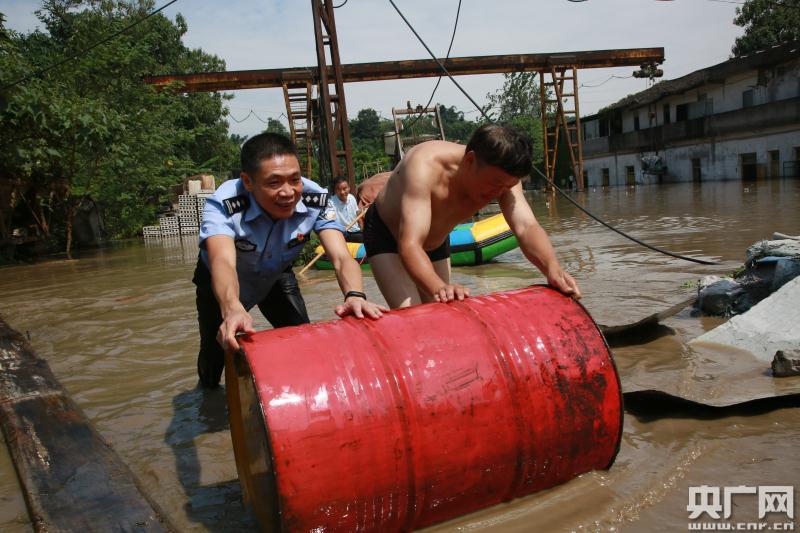8月18日早,嘉陵江洪峰抵近渝北悅來,洪峰水位超保證水位6米。位于悅來嘉陵江畔的重慶北城志遠(yuǎn)預(yù)制構(gòu)建廠廠區(qū)被淹。工廠負(fù)責(zé)人潘先生向渝北區(qū)公安分局悅來派出所求助,希望民警幫助他們轉(zhuǎn)移被淹物資。得知情況,悅來派出所所長(zhǎng)劉賓立即放下手中繁忙的工作,火速帶領(lǐng)民警輔警趕往北城志遠(yuǎn)預(yù)制構(gòu)建廠。在現(xiàn)場(chǎng),所長(zhǎng)劉賓和民警們看到滔天洪水已將整個(gè)廠區(qū)淹沒了一半,水面上到處漂浮著油桶、煤氣罐、建筑彩鋼板等物資,隨時(shí)有被洪水沖往下游的危險(xiǎn)。