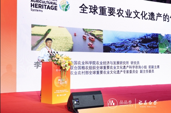 現(xiàn)場(chǎng)還延請(qǐng)兩位權(quán)威專家作專題分享。中國(guó)農(nóng)科院農(nóng)業(yè)經(jīng)濟(jì)與發(fā)展研究所研究員、聯(lián)合國(guó)糧農(nóng)組織全球重要農(nóng)業(yè)文化遺產(chǎn)科學(xué)咨詢小組前副主席李先德以《全球重要農(nóng)業(yè)文化遺產(chǎn)的傳承和發(fā)展》為題,結(jié)合全球農(nóng)遺標(biāo)準(zhǔn)與福鼎實(shí)踐,指出“福建福鼎白茶文化系統(tǒng)”的核心特征——提供食物營(yíng)養(yǎng)與生計(jì)安全保障、擁有豐富的農(nóng)業(yè)生物多樣性、當(dāng)?shù)貍鹘y(tǒng)知識(shí)與技術(shù)體系、極具地方特色的茶文化、多樣迷人的茶園景觀。同時(shí)提出保護(hù)端需守護(hù)茶樹種質(zhì)、傳統(tǒng)技藝與習(xí)俗;發(fā)展端要打造高端特色產(chǎn)品、探索茶文旅融合,并構(gòu)建“政府-企業(yè)-合作社-茶農(nóng)”多方利益共享機(jī)制,保障福鼎白茶可持續(xù)發(fā)展。
