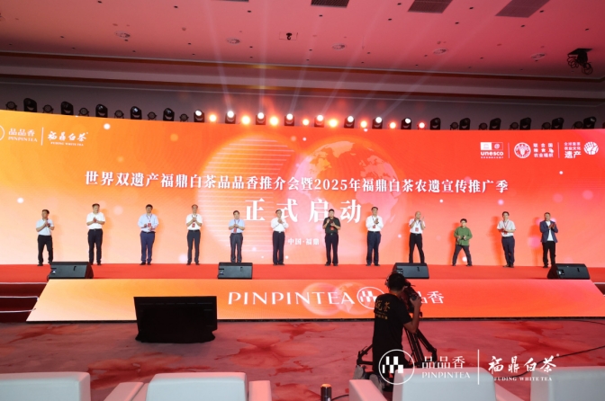 活動(dòng)隨后還舉辦了2025年福鼎白茶農(nóng)遺宣傳推廣季啟動(dòng)儀式,隨著“3、2、1”的倒數(shù)聲,12位領(lǐng)導(dǎo)嘉賓共同按下啟動(dòng)鍵,現(xiàn)場(chǎng)掌聲雷動(dòng)。按下的不僅是啟動(dòng)鍵,更是雙遺白茶全球化的“加速鍵”——標(biāo)志著福鼎白茶將以“人類非遺+全球農(nóng)遺”的雙重身份,系統(tǒng)性推進(jìn)國(guó)際傳播:既通過(guò)文化推薦官講述雙遺故事,也依托行業(yè)協(xié)會(huì)推動(dòng)品牌出海,更借助品品香等企業(yè)持續(xù)開拓的海外布局,讓雙遺白茶從太姥山下的地域特產(chǎn),成為全球消費(fèi)者感知中國(guó)茶文化的“馨香名片”。