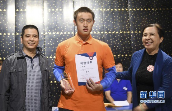 10月14日,獲得冠軍的張燁(中)在頒獎儀式上留影。新華社記者 林善傳 攝