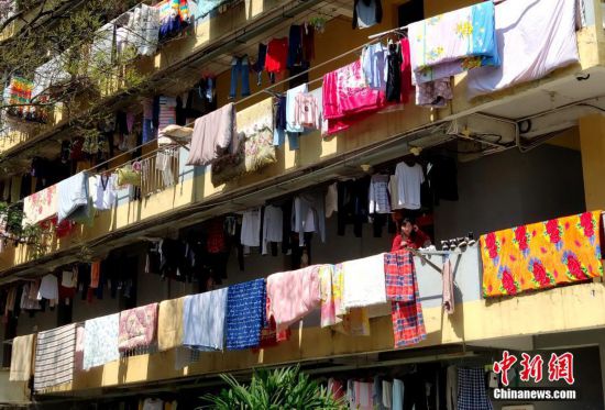 3月12日,福州市暫別陰雨天氣,迎來晴天。福州某高校的一棟宿舍樓外,學(xué)生晾曬的被子和衣物“鋪天蓋地”,成為一道別樣的風(fēng)景。中新社記者呂明攝