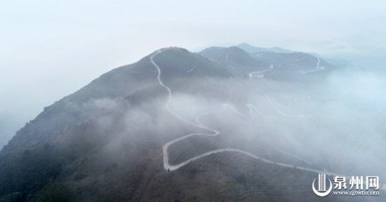 這是無人機(jī)拍攝位于安溪縣尚卿鄉(xiāng)晨霧繚繞的茶山(3月19日 攝)。