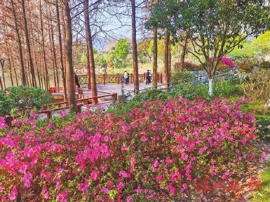 公園內(nèi),一片杜鵑花開得絢爛。