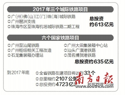 這3個城際鐵路項目分別是廣(州)佛(山)江(門)珠(海)城際鐵路、廣州琶洲支線,以及珠海市區(qū)至珠海機場城際鐵路二期工程,總投資約613億元;6個國家鐵路項目分別是廣州至汕尾鐵路、廣州樞紐相關(guān)工程改造、石龍集裝箱辦理站、廣州大田集裝箱中心站、汕頭廣澳港鐵路、茂名博賀港鐵路,總投資約635億元。