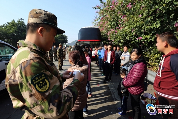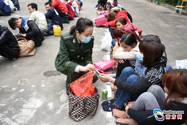 2月13日,惠州市公安邊防支隊官兵逐一核對大巴車上的人員信息。顧俊鋒 攝