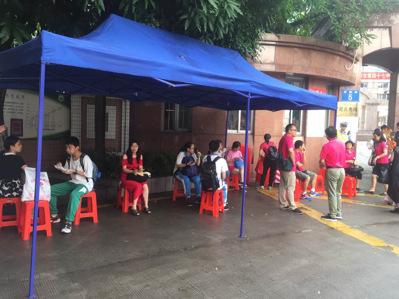 四十七中考點(diǎn),校方在考場(chǎng)外搭起棚子供家長(zhǎng)學(xué)生遮陽(yáng)擋雨。廣報(bào)記者莊小龍攝