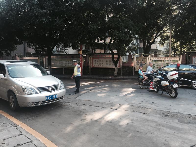 47中考點(diǎn),交警執(zhí)勤,送考車輛路口停車,考生走100多米到考場(chǎng)。