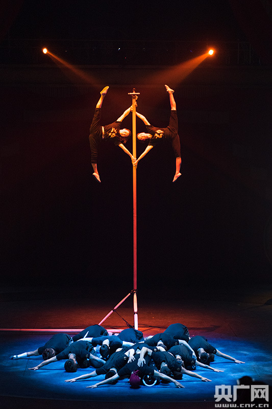 據(jù)介紹,《九級(jí)浪-桿技》是中國(guó)雜技團(tuán)探索傳統(tǒng)節(jié)目本體技藝全面突破的又一創(chuàng)新嘗試,將傳統(tǒng)的單桿、雙桿、三桿道具設(shè)計(jì)成三圍交匯的幾何角,利用三角關(guān)系的穩(wěn)定性實(shí)現(xiàn)了道具的搖擺起伏與旋轉(zhuǎn),從而巧妙地把傳統(tǒng)“爬桿”道具中的平面平行關(guān)系,轉(zhuǎn)變?yōu)榱Ⅲw幾何關(guān)系。