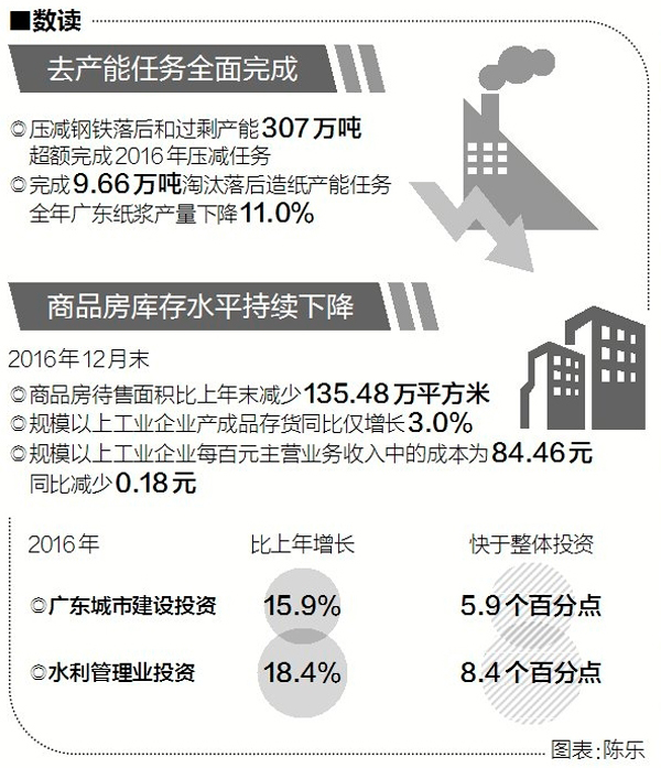 經(jīng)過(guò)近一年的實(shí)踐,廣東交出了這樣的成績(jī)單:2016年,廣東實(shí)現(xiàn)地區(qū)生產(chǎn)總值79512.05億元,同比增長(zhǎng)7.5%。這一年,廣東壓減鋼鐵落后和過(guò)剩產(chǎn)能307萬(wàn)噸,超額完成任務(wù);國(guó)有關(guān)停類“僵尸企業(yè)”實(shí)現(xiàn)市場(chǎng)出清2394戶;進(jìn)一步清理規(guī)范行政事業(yè)性收費(fèi),每年為企業(yè)減負(fù)131億元;啟動(dòng)補(bǔ)短板重大工程,將18項(xiàng)、總投資2.25萬(wàn)億元的補(bǔ)短板重大工程納入省重點(diǎn)項(xiàng)目調(diào)度。