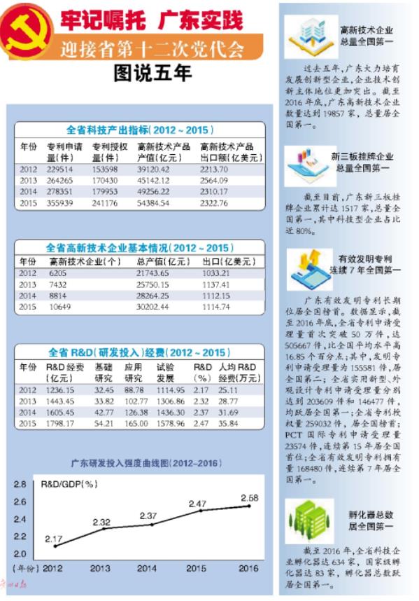 據(jù)廣州日報報道:2016年,廣東高新技術企業(yè)數(shù)量達到19857家,總量居全國第一;區(qū)域創(chuàng)新能力綜合排名連續(xù)9年位居全國第二,躋身創(chuàng)新型省份;科技投入產(chǎn)出持續(xù)增加,全省研發(fā)(R&D)投入占GDP比重提高到2.58%,發(fā)明專利申請量和PCT國際專利申請量同比增長均超過50%;關鍵核心技術不斷獲得突破,技術自給率達71%;高新技術產(chǎn)品產(chǎn)值超過5.3萬億元,占工業(yè)總產(chǎn)值的39%。