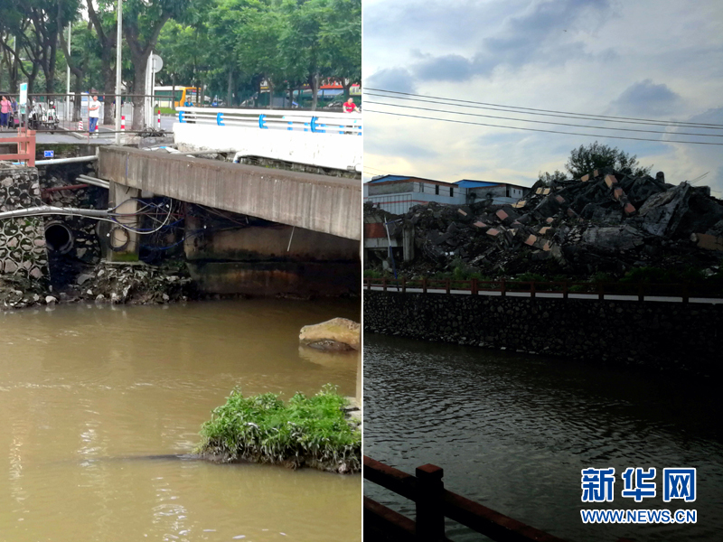 左圖:廣州白云區(qū)白海面涌的雨水口。右圖:白海面涌沿岸正加緊違法建筑清拆。新華網(wǎng)記者 盧鑒 攝