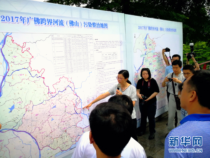 相關負責人在介紹“2017年廣佛跨界河流(佛山)污染整治地圖”。新華網(wǎng)記者 盧鑒 攝