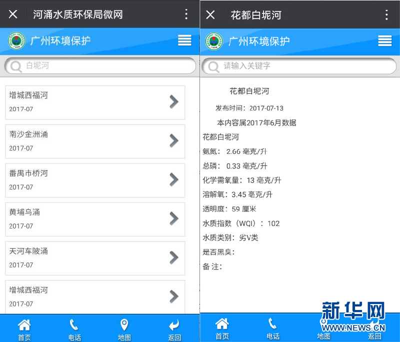 “廣州環(huán)!蔽⑿殴娞柮吭鹿紡V州重點河流水質情況,白坭河2017年6月仍為劣V類水質。新華網(wǎng)記者盧鑒 攝