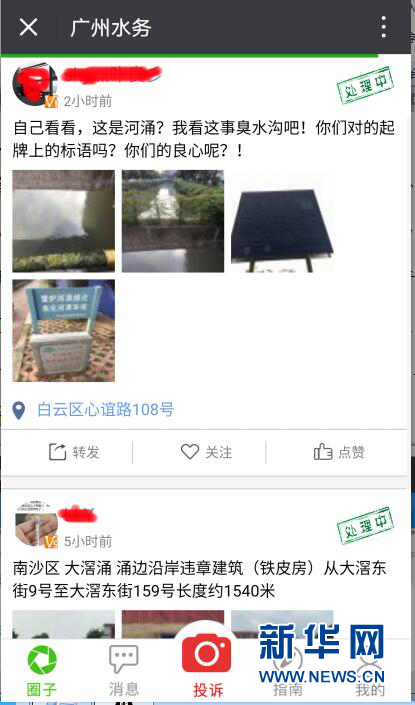 圖為“廣州水務”微信公眾號水污染投訴平臺截屏。新華網(wǎng) 記者盧鑒 攝