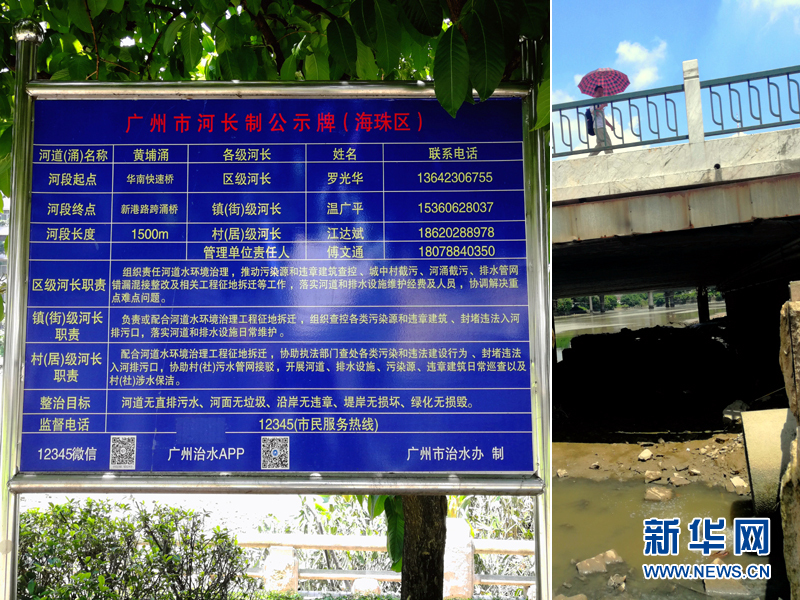 左圖:廣州海珠區(qū)黃埔涌新港東路段“河長制公示牌”上印有投訴的微信二維碼。右圖:橋上路過的人觀看黃埔涌排水口。新華網(wǎng)記者 盧鑒 攝