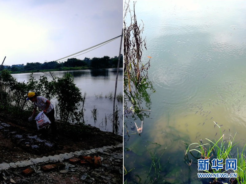 廣州白坭河畔附近的養(yǎng)殖戶,右圖河中是她養(yǎng)的魚,河邊雜草叢生。新華網(wǎng)記者盧鑒 攝