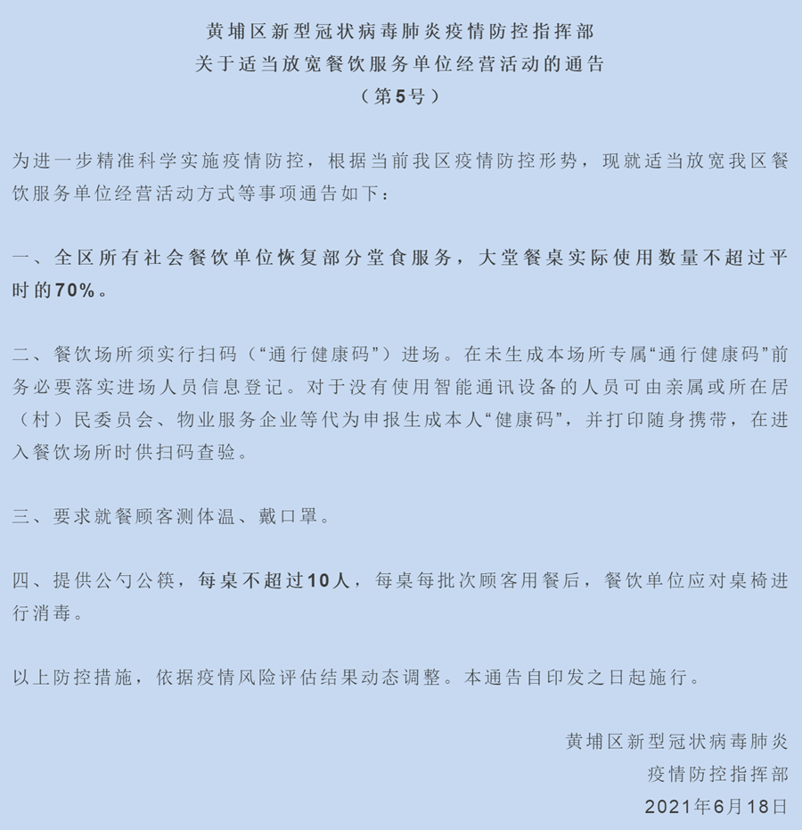 央廣網(wǎng)廣州6月18日消息(記者夏燕)6月18日,根據(jù)當(dāng)前疫情防控形勢(shì),廣州黃埔區(qū)決定適當(dāng)放寬區(qū)內(nèi)餐飲服務(wù)單位經(jīng)營(yíng)活動(dòng)方式。