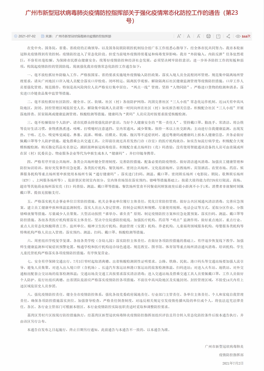 央廣網(wǎng)廣州7月2日消息(記者夏燕)7月2日晚,廣州市新型冠狀病毒肺炎疫情防控指揮部發(fā)布關(guān)于強(qiáng)化疫情常態(tài)化防控工作的通告(第23號(hào))。