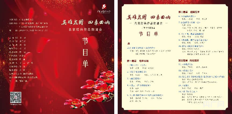 嶺南春來早,木棉花又紅。丹心昭日月,浩氣貫長空。為弘揚長征精神,賡續(xù)紅色血脈,緬懷革命先輩,傳承中華優(yōu)秀傳統(tǒng)文化,講好廣州英雄城的英雄故事,傳播好嶺南的中國聲音。由廣東省朗誦協(xié)會主辦的“英雄花開·四季回響”名家經(jīng)典作品朗誦會于3月16日晚在廣州中山紀念堂隆重舉行。朗誦會得到了廣州中山紀念堂、廣東省紅色傳統(tǒng)文化傳媒研究院、央廣網(wǎng)廣東頻道的大力支持。本場朗誦會是2026廣州市英雄花開英雄城系列活動的重要活動之一。朗誦會由序和“號聲長鳴”“祖國萬歲”“向往美好”三個篇章組成。