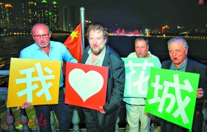 《阿依達(dá)》劇團(tuán)主演一行人在粵劇紅船上與廣州美景合影。蘇俊杰攝