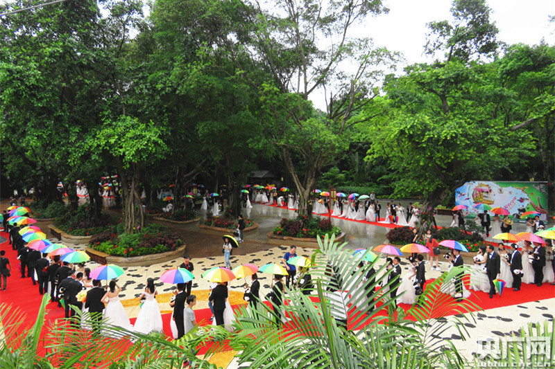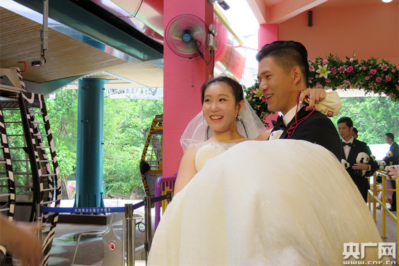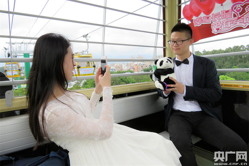 央廣網(wǎng)廣州7月8日消息(記者 王雪薇)草坪婚禮、海邊婚禮見得多了,而有機(jī)會(huì)在空中許下愛的誓言則并不多見。7月8日中午,全球最大的空中集體婚禮在廣州長隆野生動(dòng)物世界舉行,來自全國的227對新人乘坐227個(gè)空中纜車,留下了足以銘記一生的時(shí)刻。