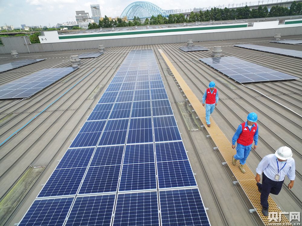 南方電網(wǎng)廣東佛山南海桂城供電所工作人員到普洛斯三山物流園檢查光伏裝置。(央廣網(wǎng)發(fā) 張宇暉 攝)